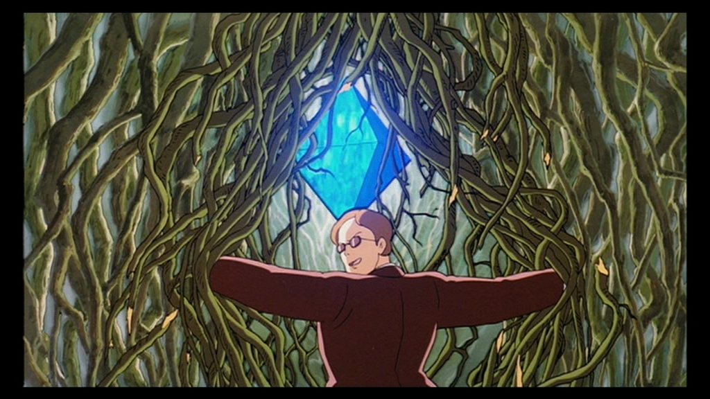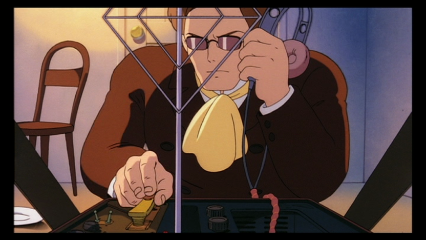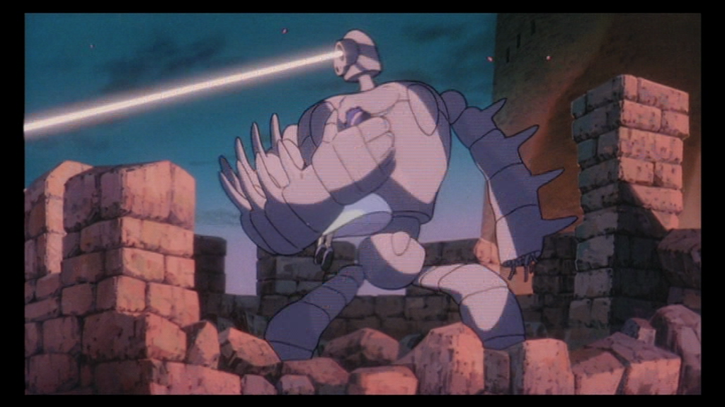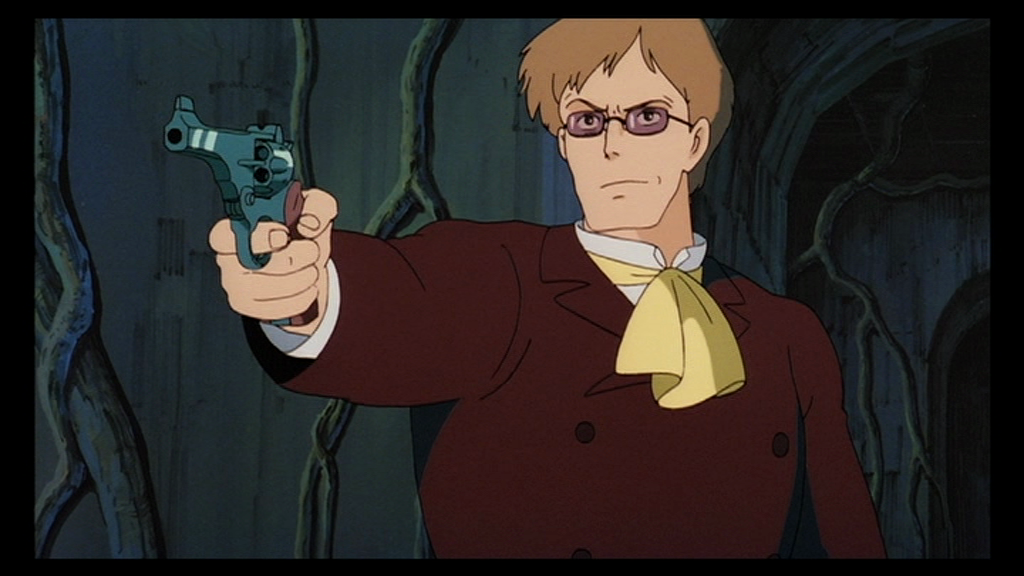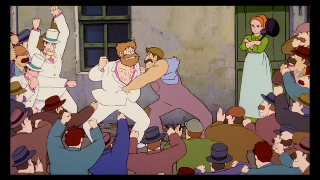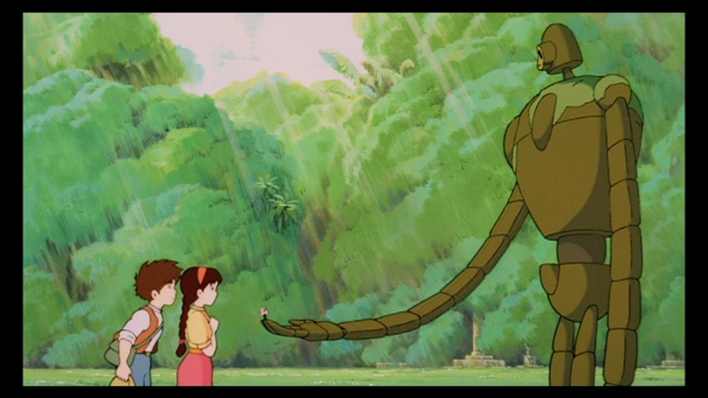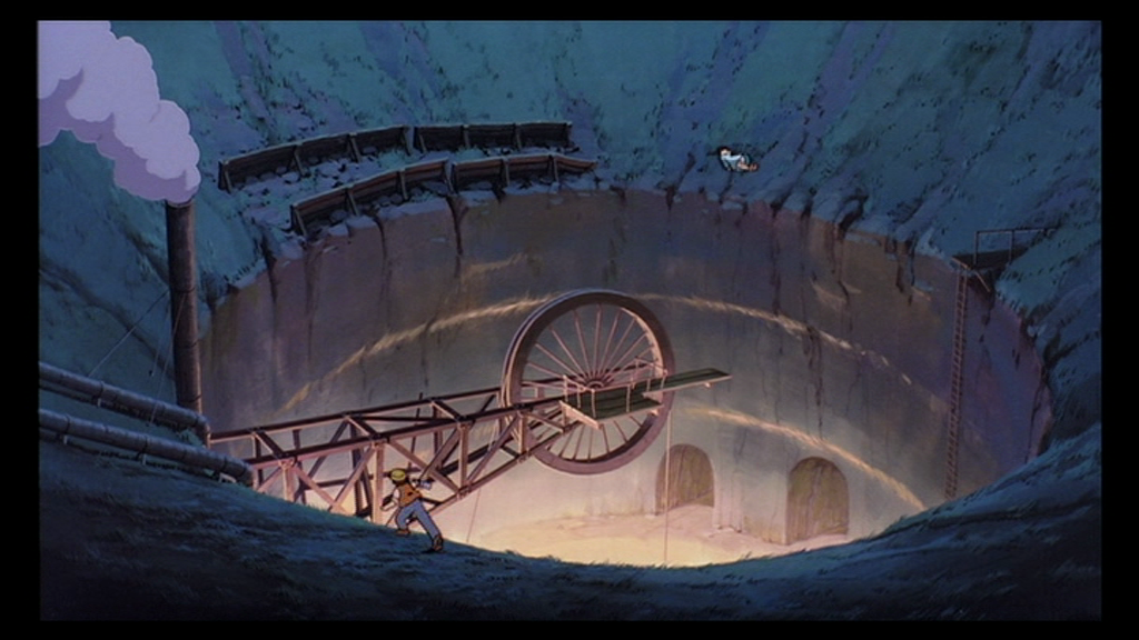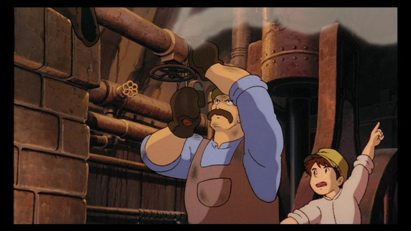 There's also something familiar about the animation here: some of the cartoon violence is reminiscent of Lupin III: The Castle of Cagliostro. This is especially evident in the brawl between the government lackeys and the miners in Pazu's hometown. There are several familiar faces too in a group of Fox Squirrels from Nausicaä that playfully dance around the shoulders of a robot gardener.